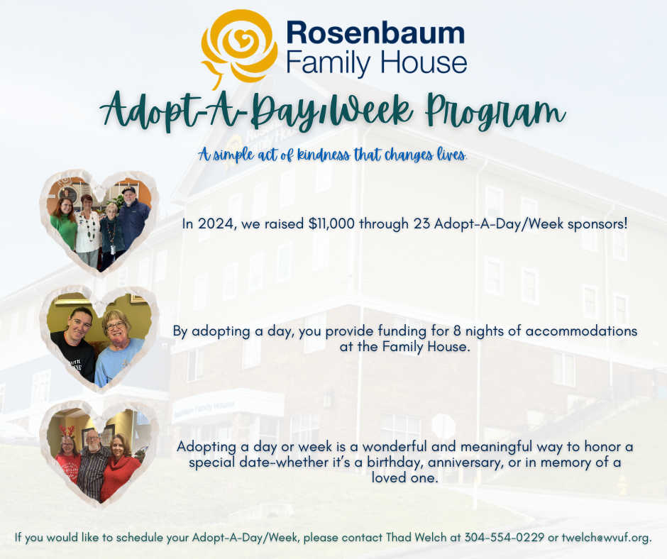 While many of our families can pay the $30 per night fee, others lack the financial means. Since no one is turned away if they cannot afford it, your tax-deductible contribution is essential. It will help provide the support we need to maintain operations while keeping fees to a minimum for those we serve. The WVU Foundation serves as the fiduciary agent for the Rosenbaum Family House.